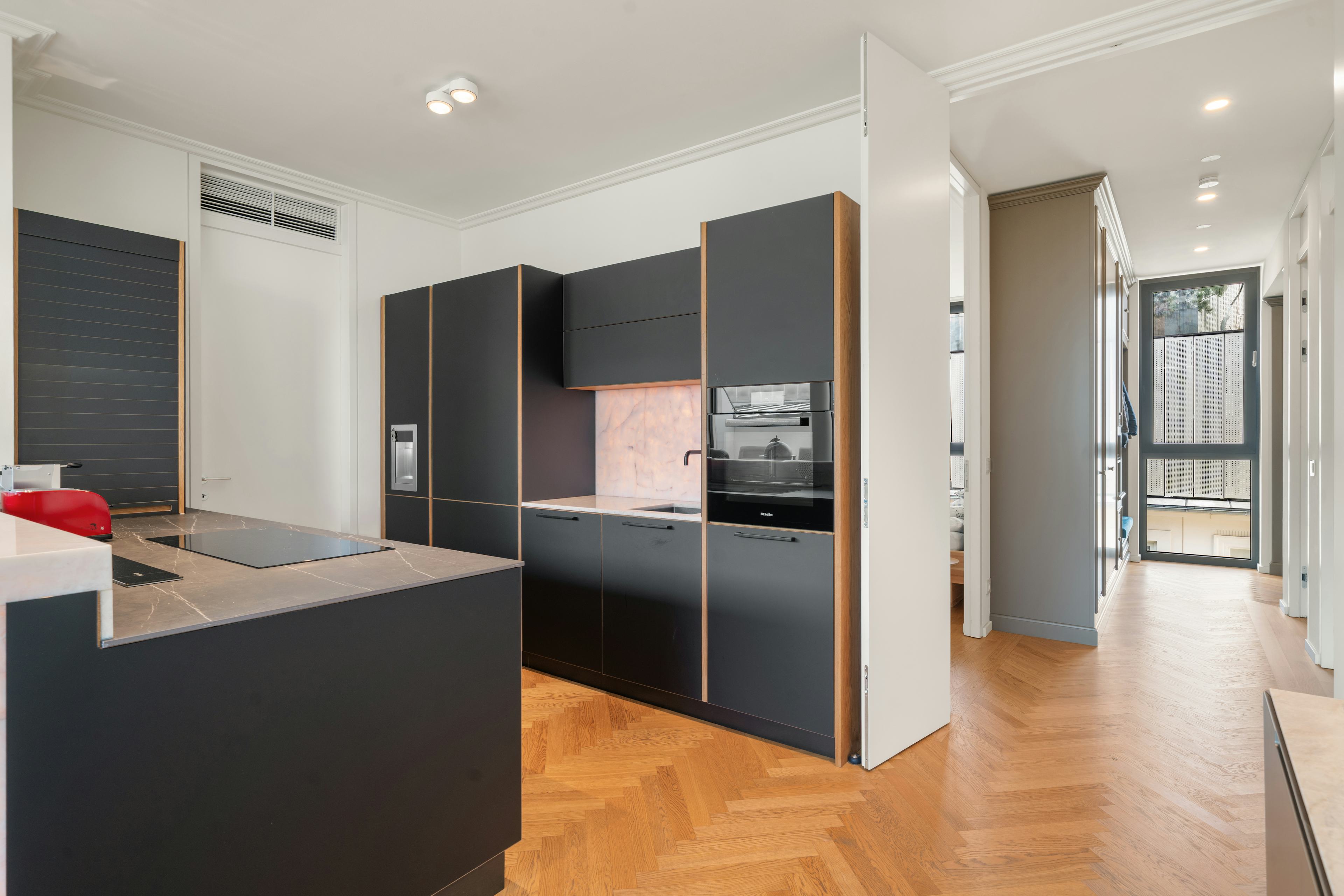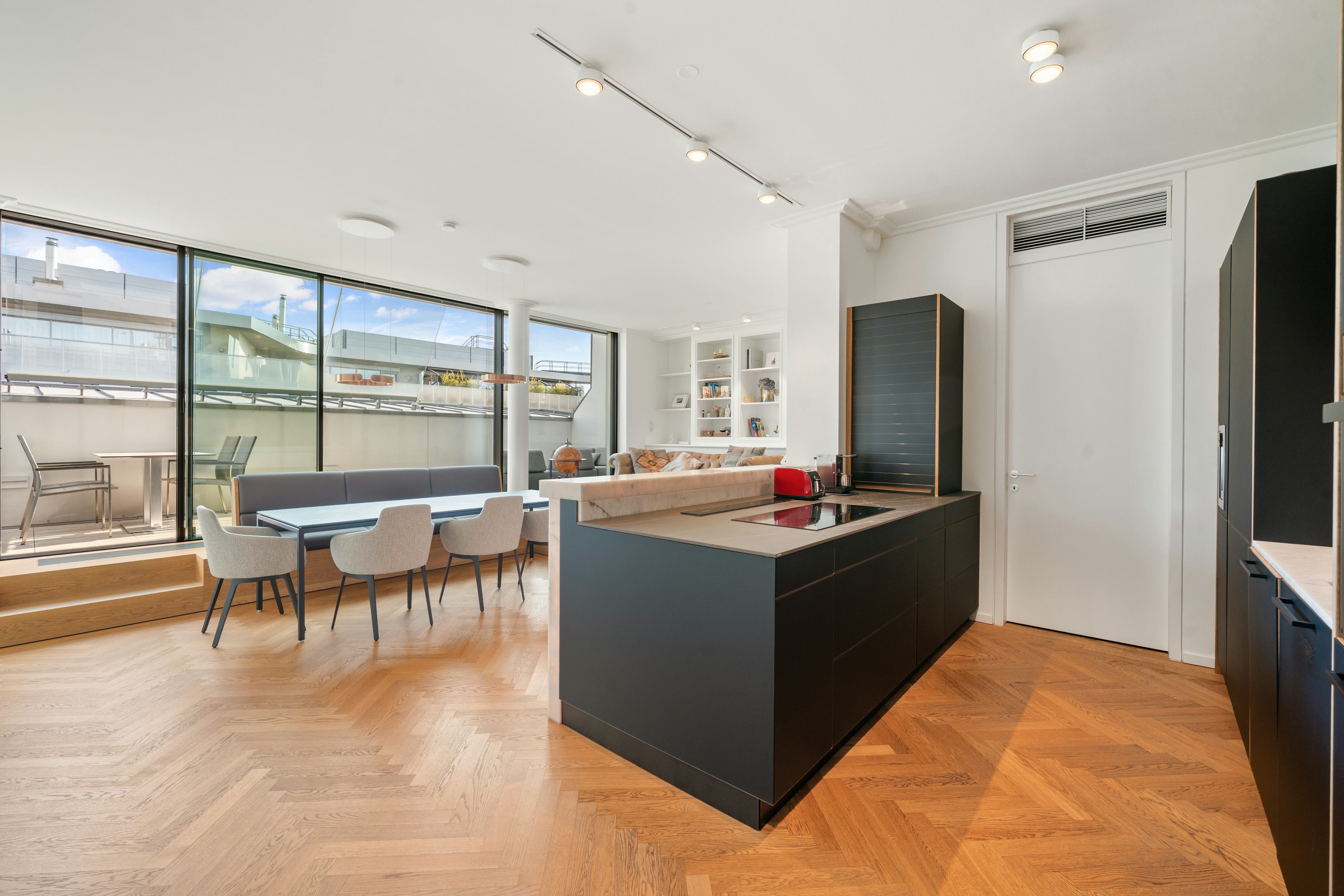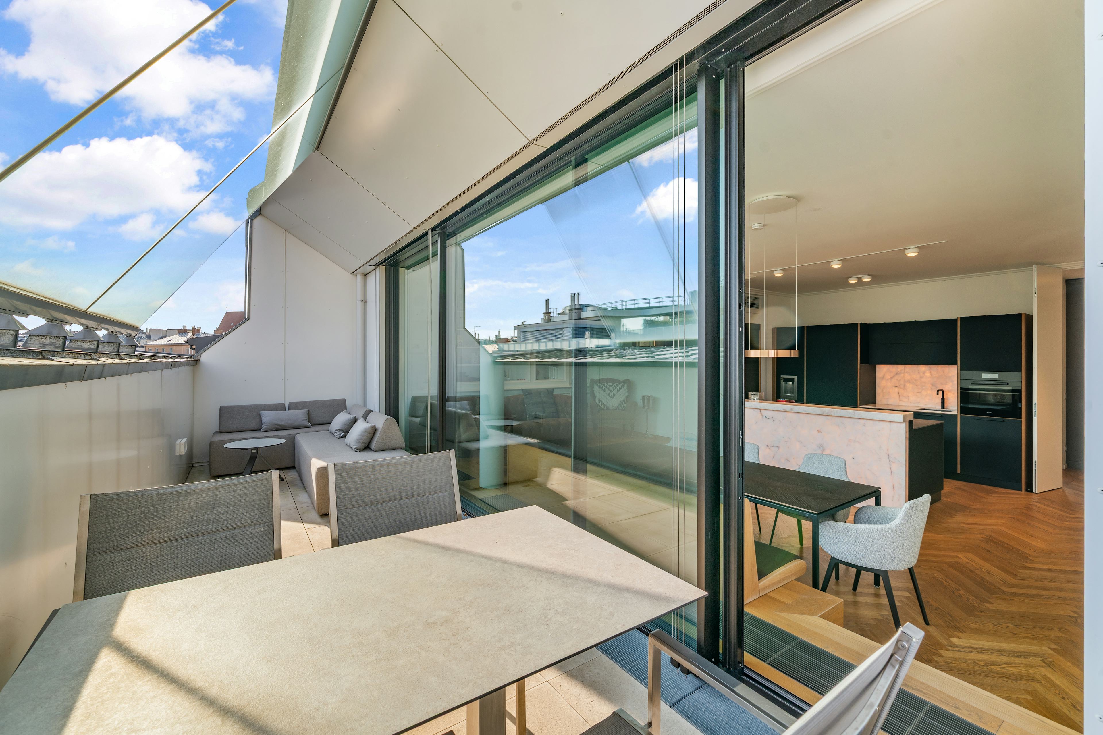 Inmitten der historischen Wiener Innenstadt, eingebettet in ein aufwendig revitalisiertes Gründerzeithaus in der Neutorgasse, präsentiert sich diese außergewöhnliche Stadtwohnung im obersten Geschoss als harmonische Verbindung aus historischer Substanz, moderner Architektur und zeitgemäßem Wohnkomfort. Die Stadtresidenz erstreckt sich über großzügige 117 m² Wohnfläche und überzeugt mit einem durchdachten Raumkonzept, das Offenheit, Licht und Funktionalität auf höchstem Niveau vereint. Eine Raumhöhe von 2,89 m unterstreicht das luftige Wohngefühl und verleiht den Räumen zusätzliche Großzügigkeit. Bereits beim Eintreten öffnet sich ein repräsentativer Empfangsbereich, der nahtlos in den rund 45 m² großen Wohnbereich übergeht – die stilvolle Wohnküche. Dieser außergewöhnlich großzügige Lebensraum vereint Kochen, Essen und Wohnen zu einem eleganten Gesamterlebnis und besticht durch ein offenes, lichtdurchflutetes Ambiente. Großflächige Verglasungen schaffen eine faszinierende Verbindung zwischen Innen- und Außenraum. Die beiden Schlafzimmer – jeweils mit edlem Bad en suite – versprechen höchsten Komfort und ungestörte Privatsphäre. Das hochwertige Mobiliar kann auf Wunsch und gegen Vereinbarung übernommen werden. Ein besonderes Highlight bilden die großzügigen Außenbereiche in Form einer Loggia bzw. 2 kleinen Terrassen auf Wohnebene, die mit insgesamt rund 23 m² als exklusiver Rückzugsort mitten in der Wiener Innenstadt fungieren und den Wohnraum harmonisch ins Freie erweitern. Gegen Aufpreis kann zudem ein PKW-Stellplatz im Haus erworben werden, der zusätzlichen Komfort im urbanen Umfeld bietet.