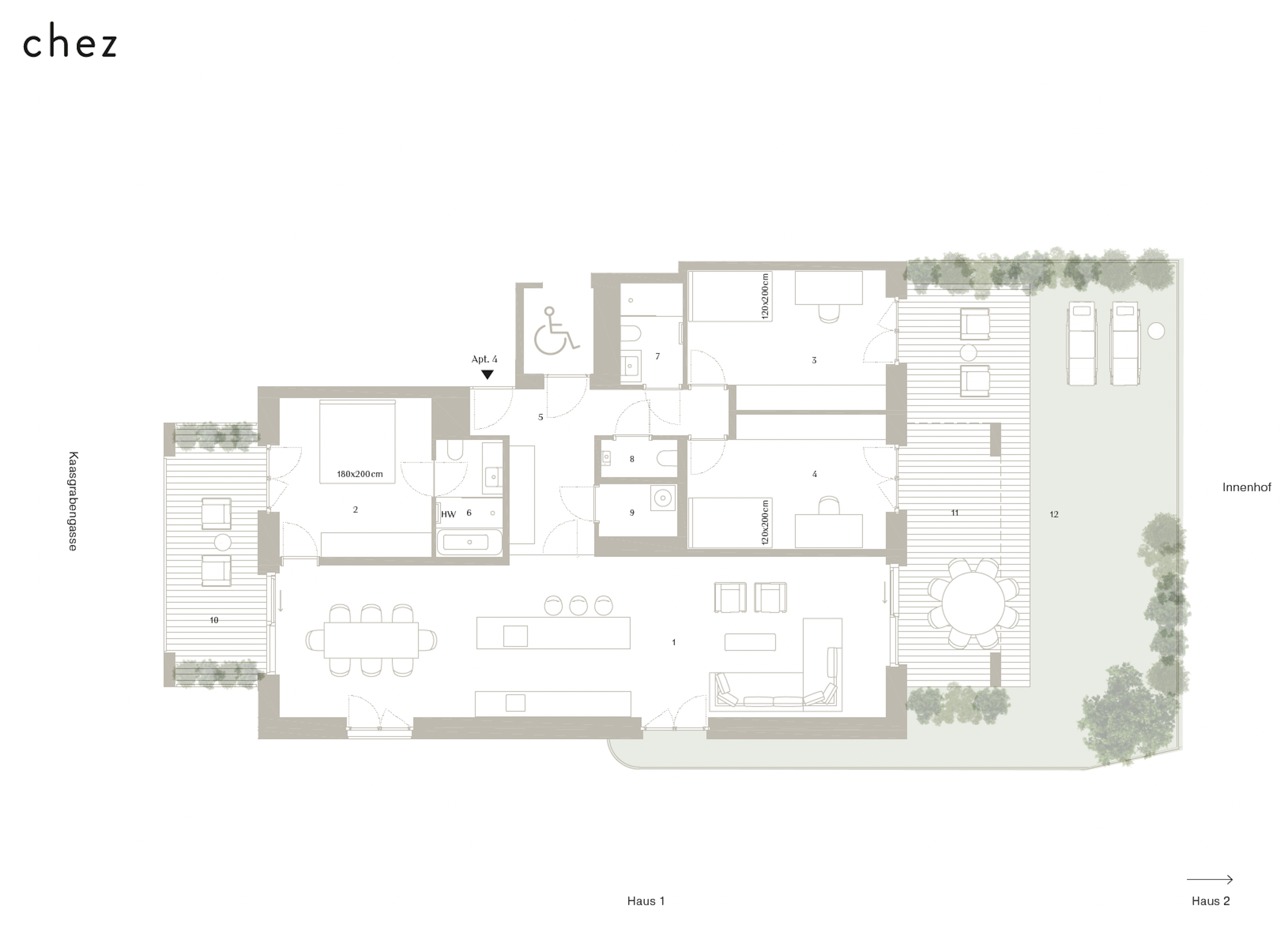 Dieses großzügige Apartment erstreckt sich über das Obergeschoss und bietet eine durchdachte Raumaufteilung, die sowohl für Familien als auch für Paare ideal ist. Die Wohnung verfügt über eine geräumige Wohnküche, drei Zimmer, die flexibel genutzt werden können, zwei moderne Badezimmer sowie einen praktischen Abstellraum.