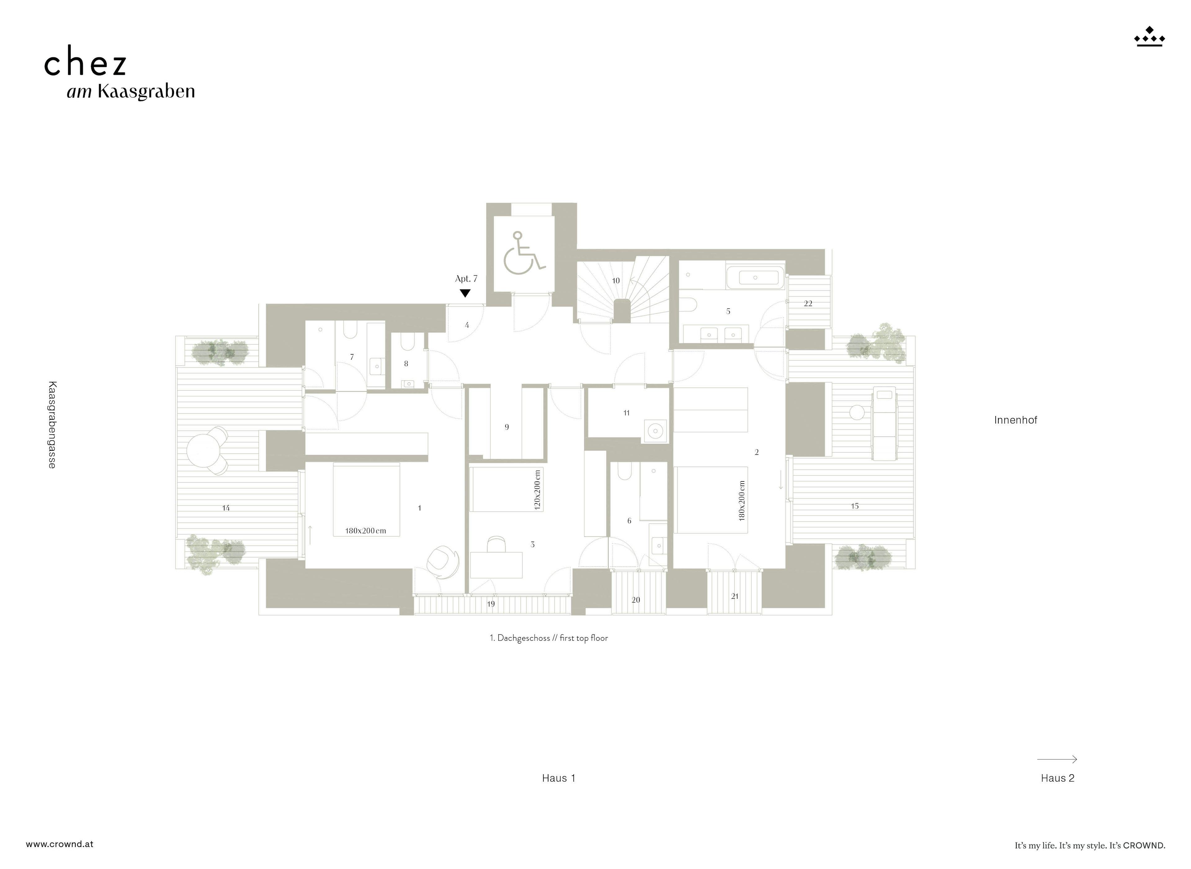 Das zweite Dachgeschoss besticht durch eine beeindruckende Wohnküche, die viel Platz für geselliges Beisammensein bietet. Von hier aus gelangen Sie auf mehrere Terrassen, die zusammen mit einer großzügigen Dachterrasse viel Raum für Entspannung im Freien bieten. Zwei Balkone ergänzen das großzügige Außenangebot. Ein geräumiges Kellerabteil sorgt für zusätzlichen Stauraum. Diese Wohnung ist perfekt für anspruchsvolle Bewohner, die ein elegantes und großzügiges Zuhause suchen.