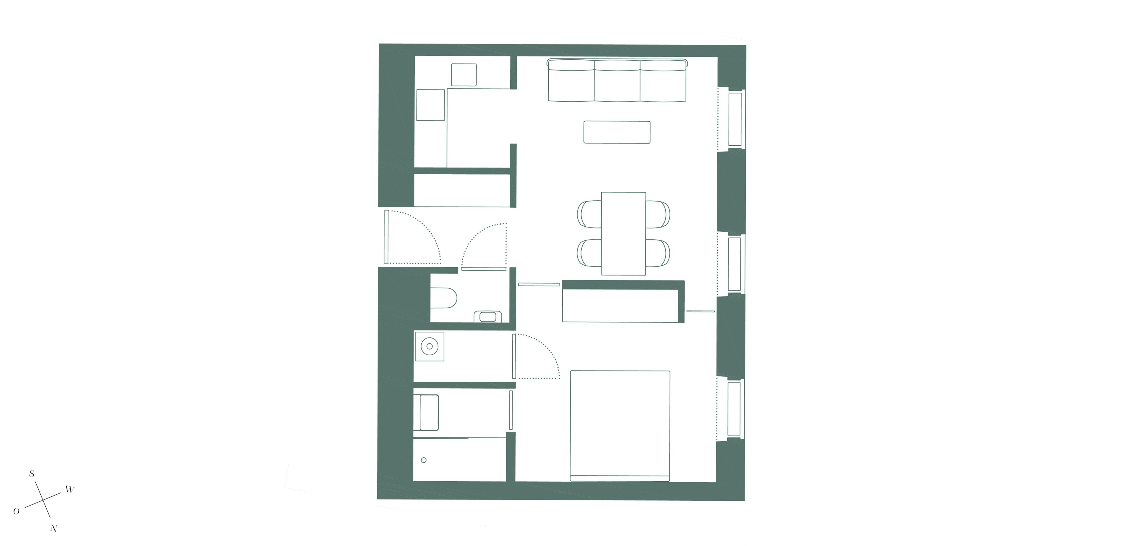 Top 20 bietet mit seinen ca. 41 m² eine ideale Raumeinteilung. Das Studio eignet sich besonders gut für Singles. Eine Trennwand zwischen Wohn-Ess-Bereich und dem angedeuteten Schlafzimmer sorgt für extra Privatsphäre beim Empfang von Gästen.