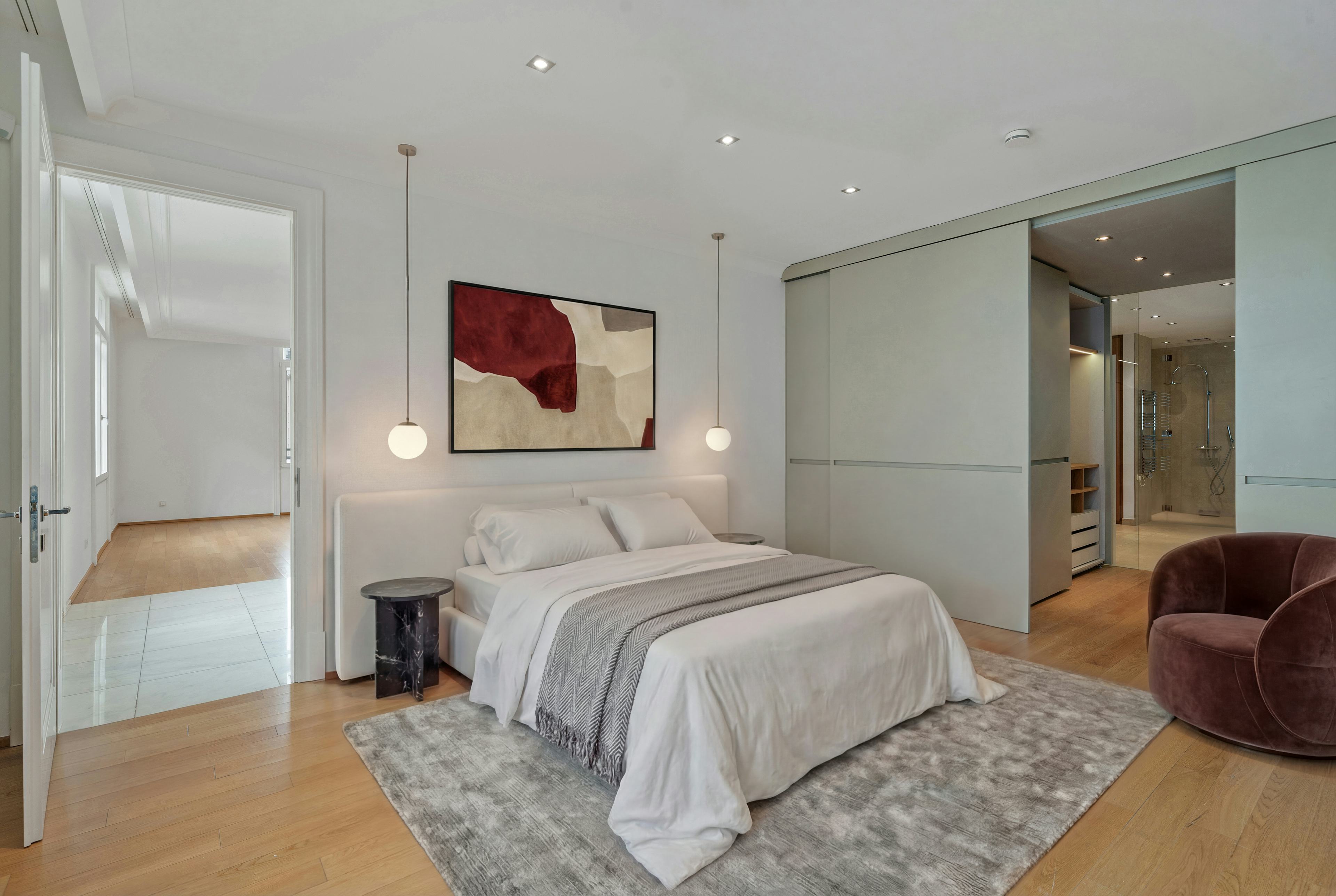 Ein hochwertig ausgestattetes Designerbad mit freistehender Badewanne und Walk-in-Dusche, ein großzügiger Schrankraum sowie ein separater Wirtschaftsraum unterstreichen den hohen Wohnkomfort. Ein Garagenplatz mit bequemem Liftzugang rundet dieses exklusive Angebot ab.