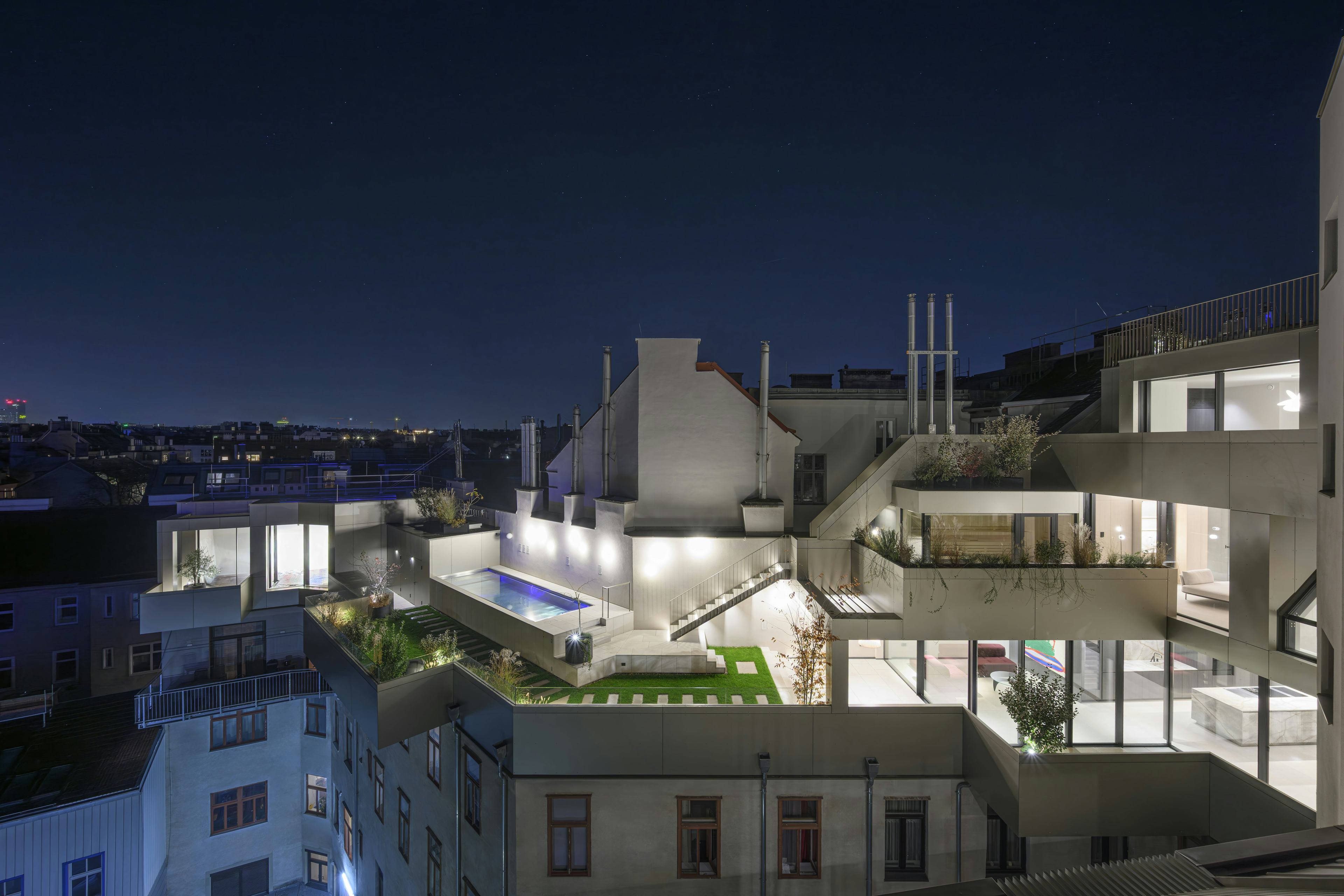 Penthouse – 3 Wohnebenen plus Dachterrasse (insgesamt 4 Ebenen) – ca. 558 m² Wohnfläche, ca. 330 m² Außenfläche – Pool, Jacuzzi, separate Orangerie/Studio mit eigenem Zugang – 5 Stellplätze (2 Garage, 3 offen bzw. überdacht) – Raumhöhen bis zu 6m, offene Lufträume über mehrere Ebenen – Liftzugang zu allen Etagen inkl. Dachterrasse – uneinsehbare Privatsphäre durch Innenhoflage