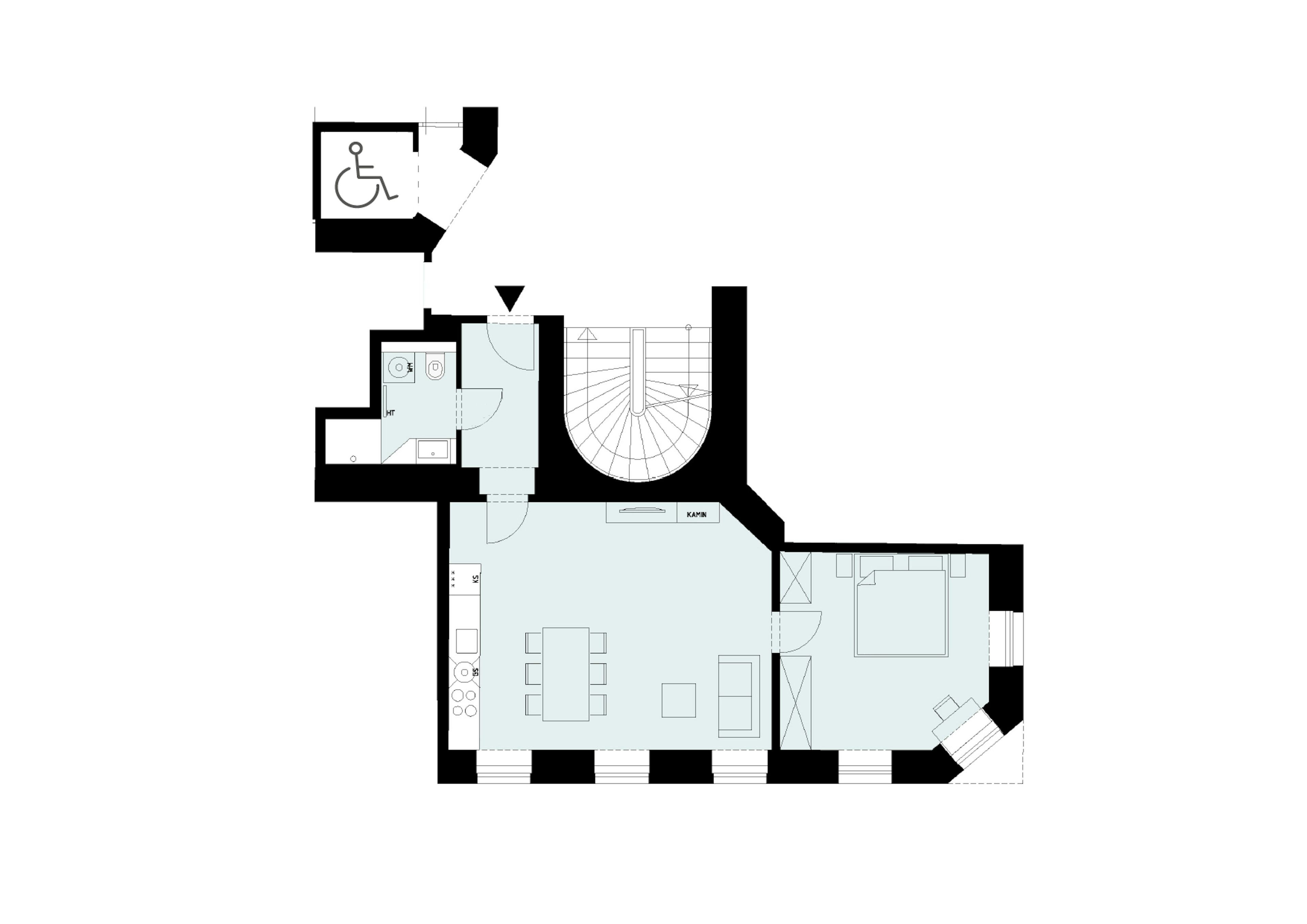 Diese Wohnung präsentiert einen einladenden Vorraum, ein Badezimmer mit Dusche und WC sowie eine geräumige Wohnküche mit einem einladenden Kamin für gemütliche Abende. Das Schlafzimmer bietet eine behagliche Rückzugsmöglichkeit nach einem langen Tag.