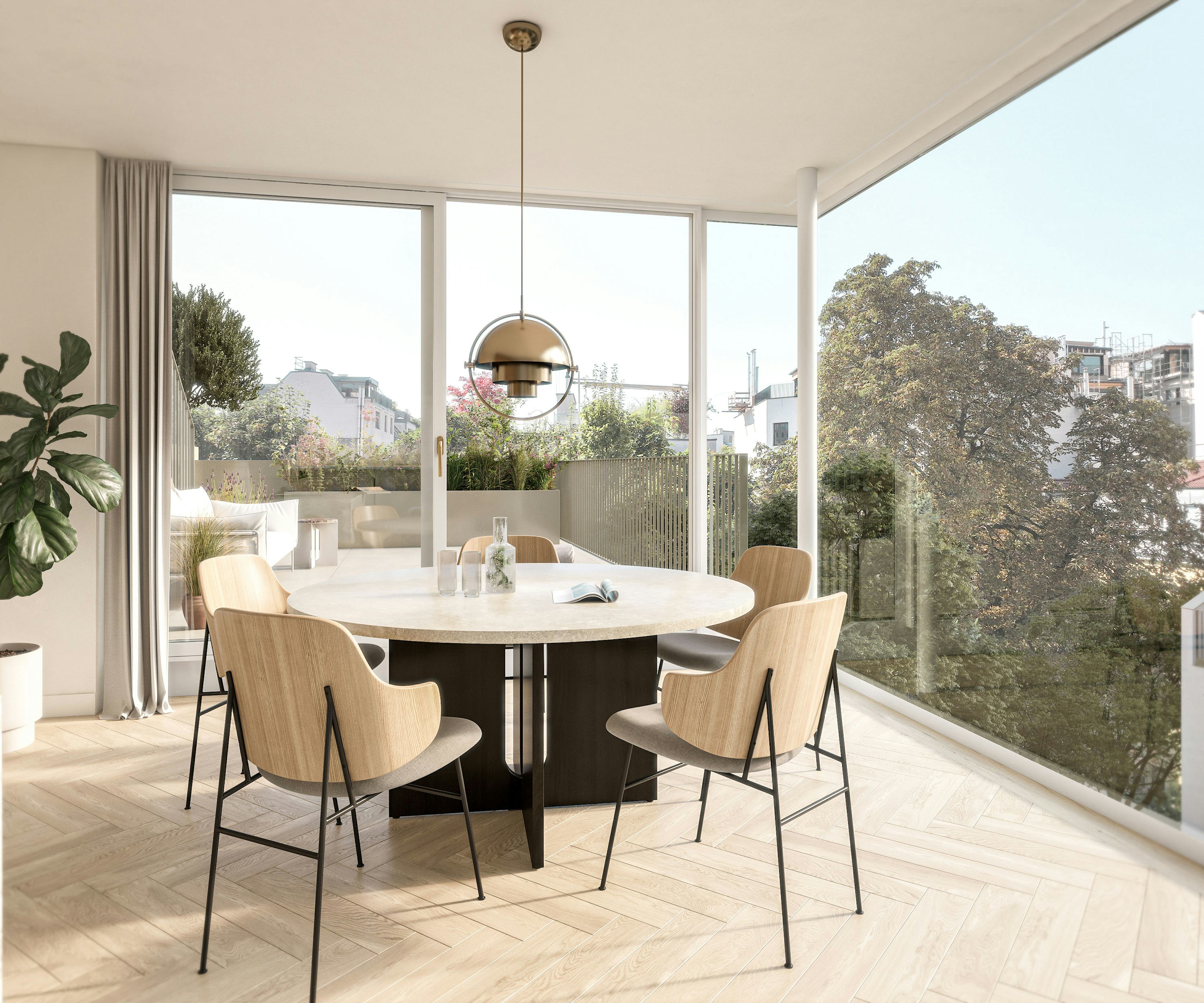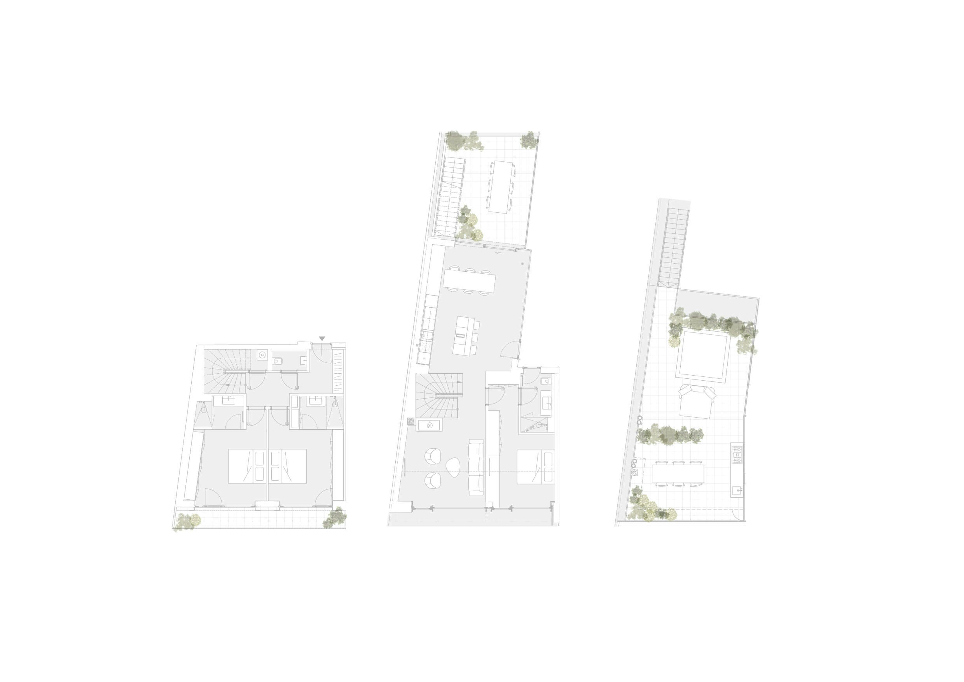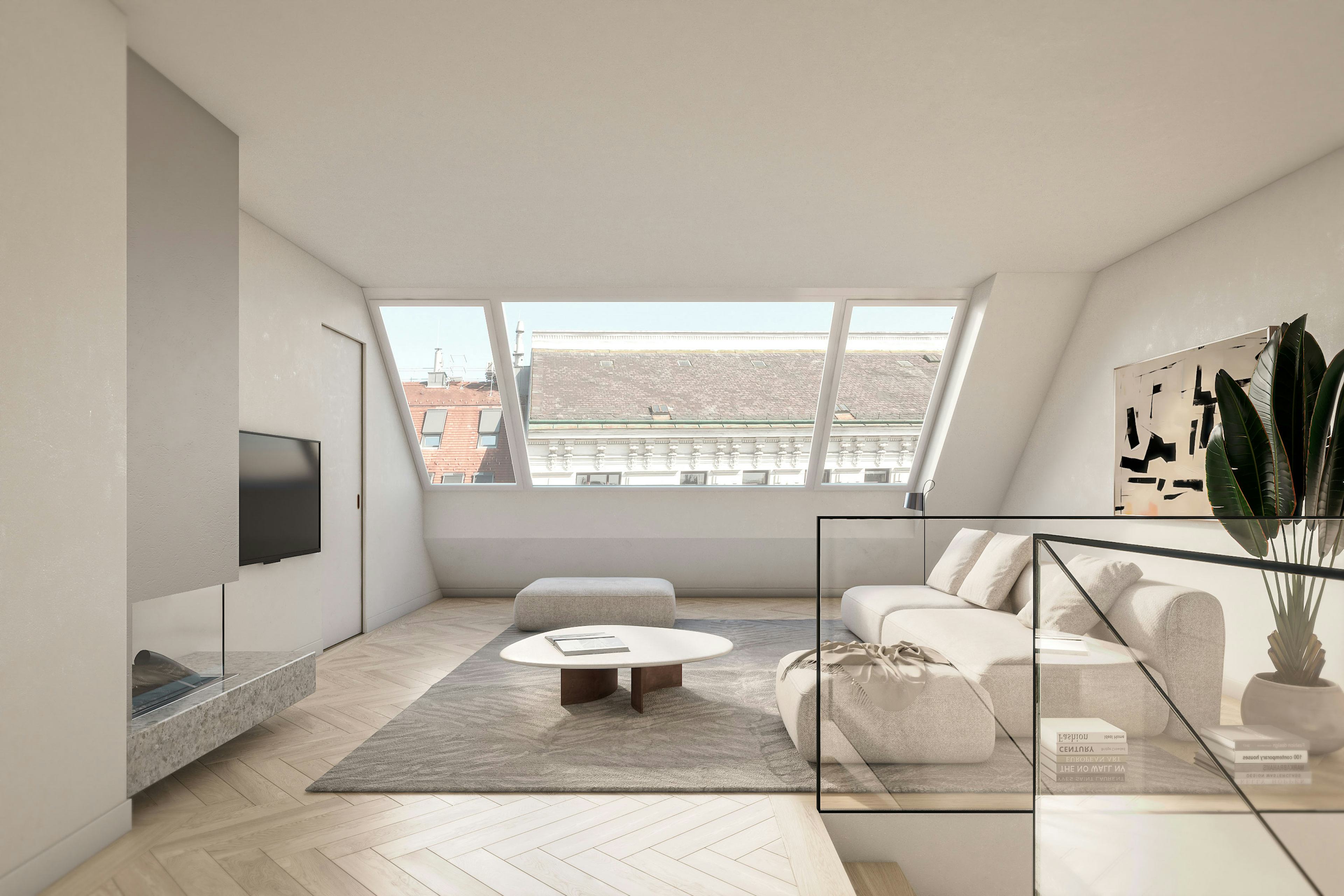 Apartment 13 schafft auf seinen insgesamt 234.72 m² Platz zum Entfalten. Angefangen im 1. Dachgeschoss, wo sich die beiden Schlafzimmer befinden, jedes davon mit direktem Zugang zur Loggia und en Suite Badezimmer ausgestattet. Das 2. Dachgeschoss ist das Herzstück der Wohnung, hier wurde ein offener Wohn- und Essbereich mit offener Küche und einem Kamin konzipiert. Vom Essbereich gelangt man auf die ruhige, nach hinten ausgerichtete Terrasse, über die die Dachterrasse zu erreichen ist. Die Dachterrasse mit Option zur Outdoorküche und einem Pool ist das Highlight dieses Apartments.