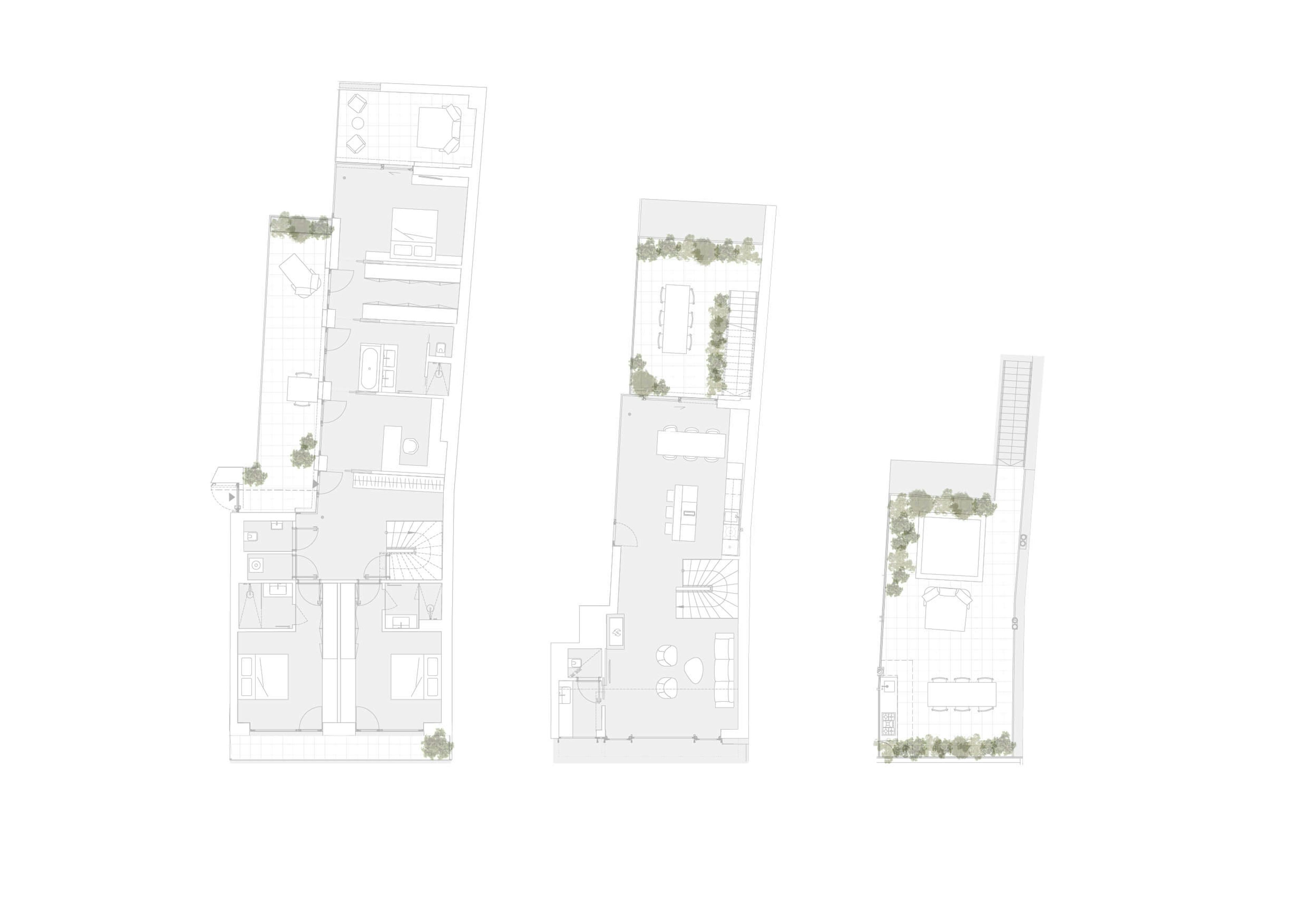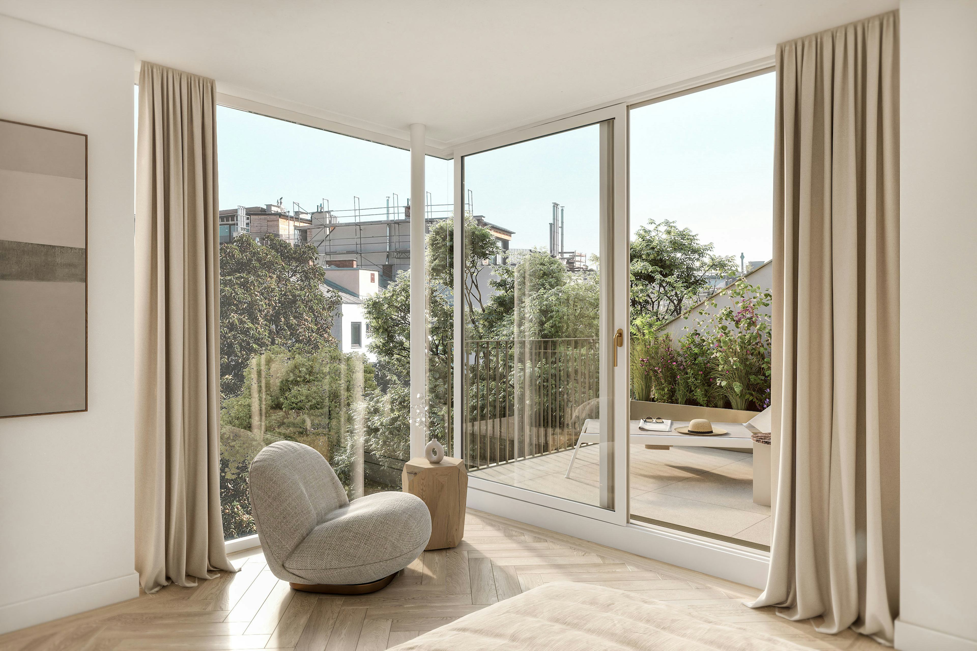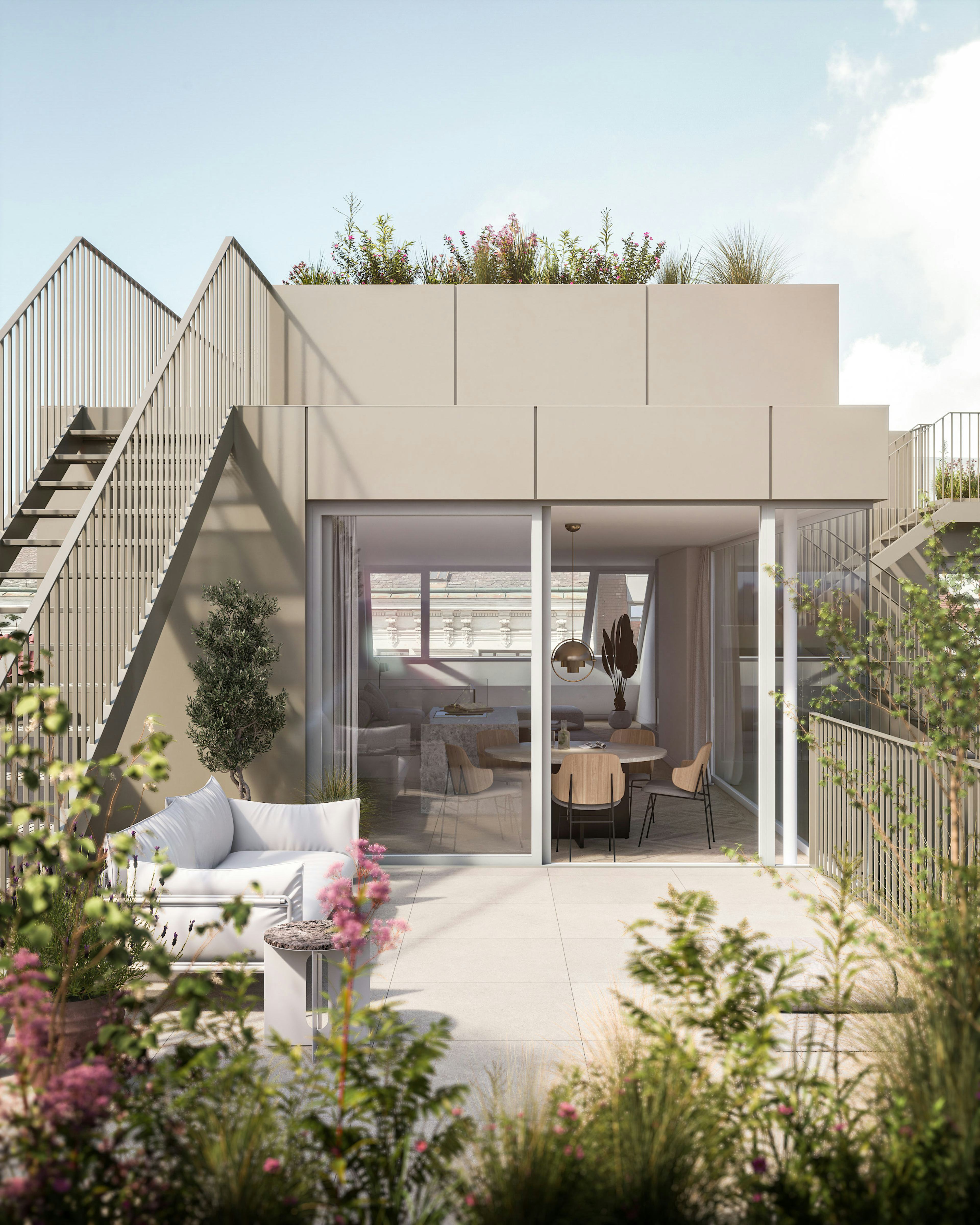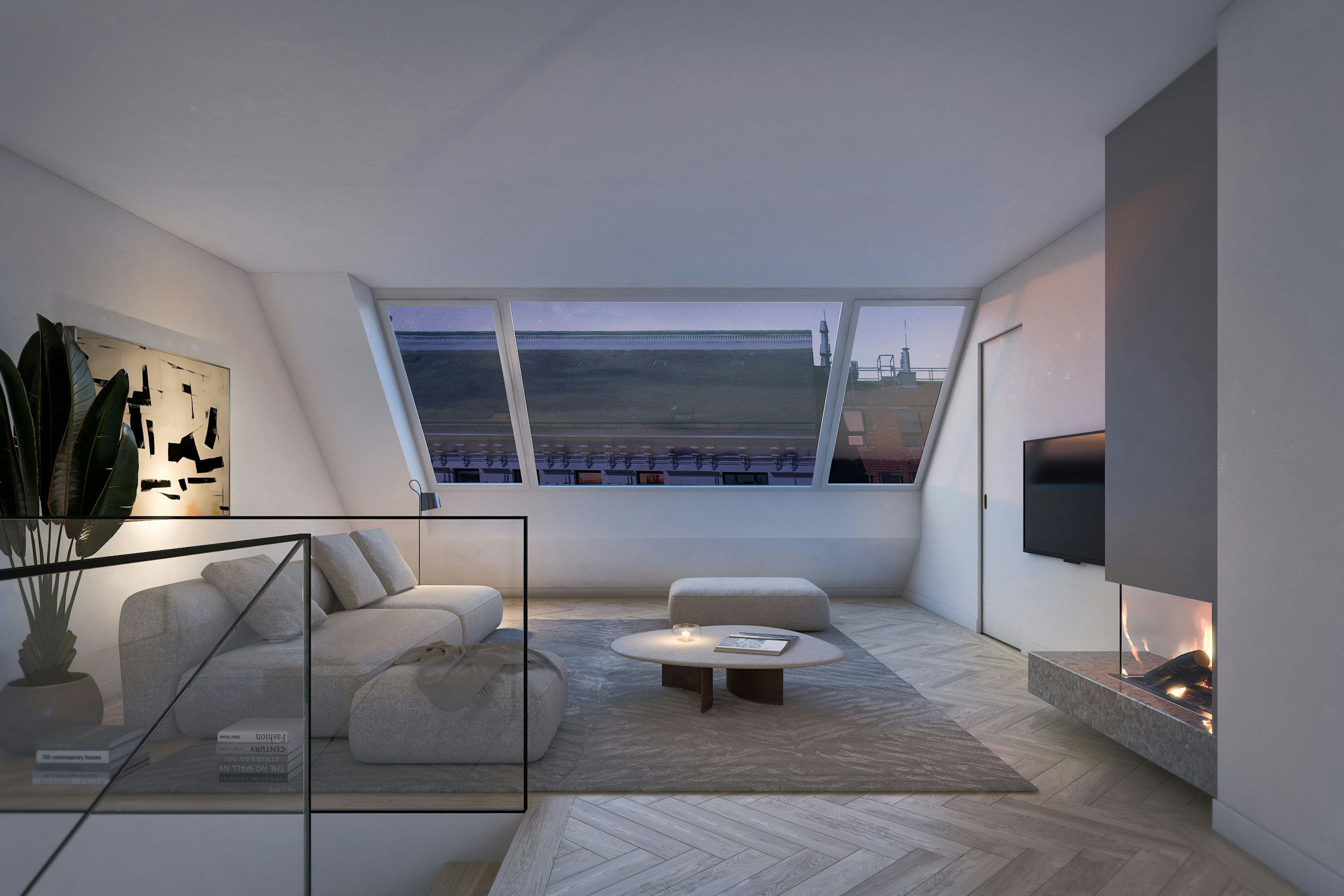 Apartment 15 bietet auf insgesamt drei Ebenen Raum für die ganze Familie. Angefangen im 1. Dachgeschoss, wo sich die Schlafzimmer, jedes davon mit en Suite Badezimmer ausgestattet, einem getrennten Homeoffice Bereich sowie einem Schrankraum, befinden. Das 2. Dachgeschoss ist das Herzstück der Wohnung, hier wurde ein offener Wohn- und Essbereich mit offener Küche und einem Kamin konzipiert. Vom Essbereich gelangt man auf die ruhige, nach hinten ausgerichtete Terrasse, über die die Dachterrasse zu erreichen ist. Die Dachterrasse mit Option zur Outdoorküche und einem Pool ist das Highlight dieses Apartments.