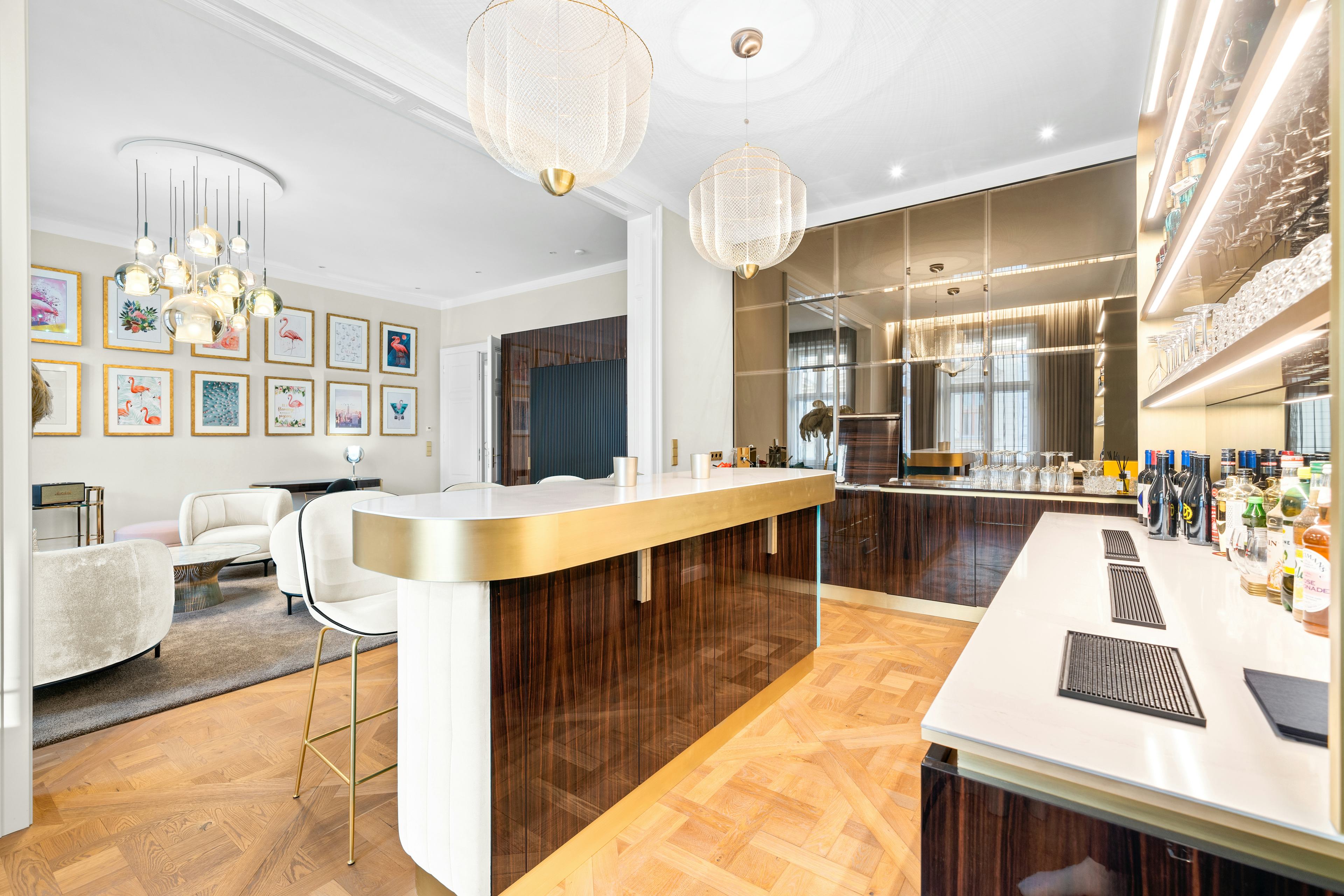 Maßgefertigte Einbauten, edle Naturmaterialien, stimmungsvolle Lichtkonzepte und ein integriertes Smart-Home-System schaffen ein Ambiente, das höchsten Ansprüchen gerecht wird. Der offen gestaltete Wohnbereich mit stilvoller Bar und Balkon bietet den perfekten Rahmen für entspannte Rückzugsorte wie auch repräsentative Momente. Für Stadtliebhaber, Kosmopoliten und alle, die das Außergewöhnliche suchen.