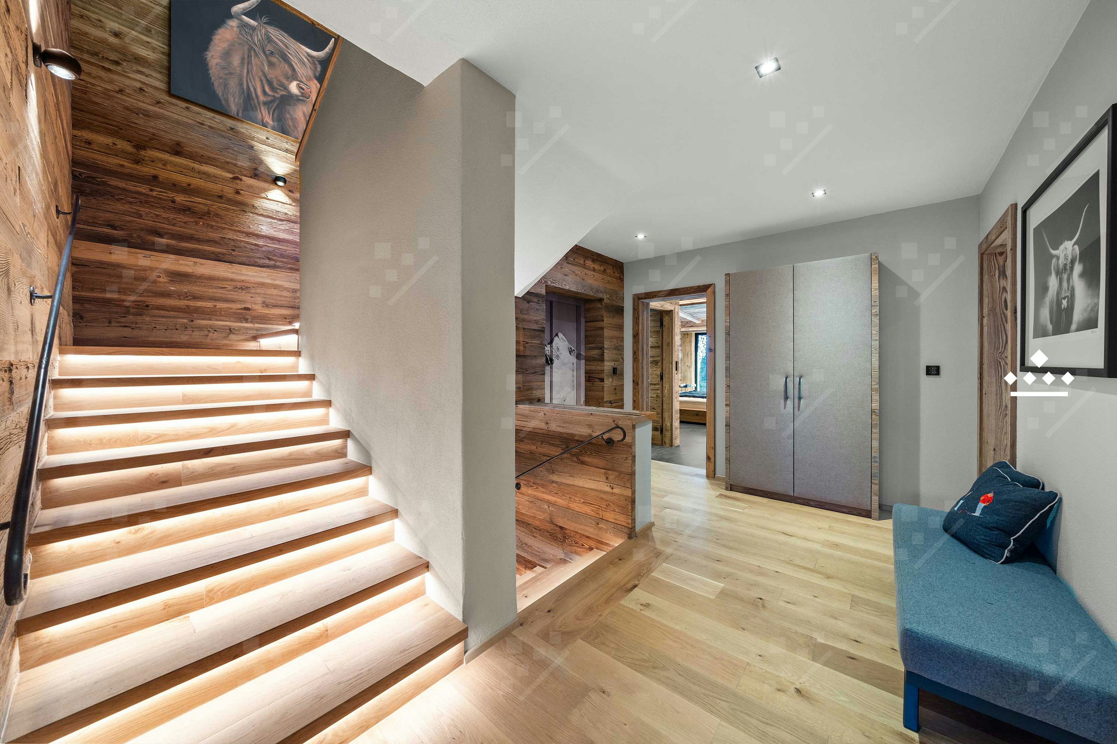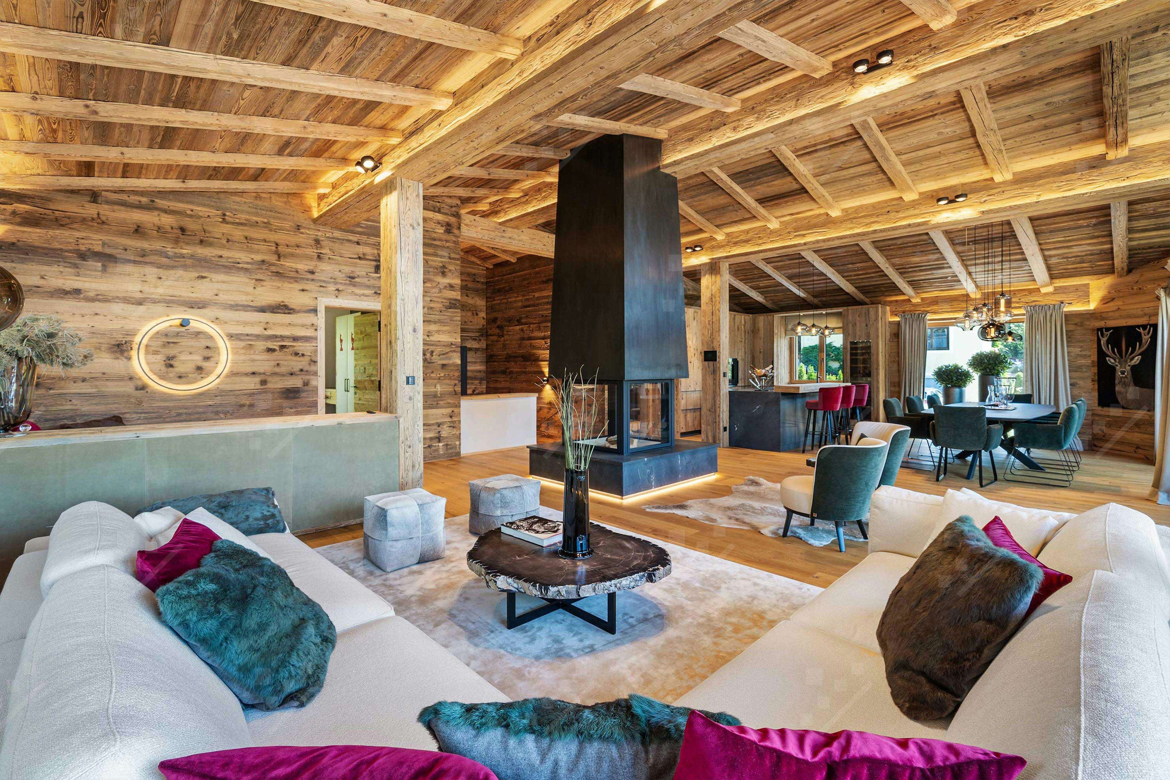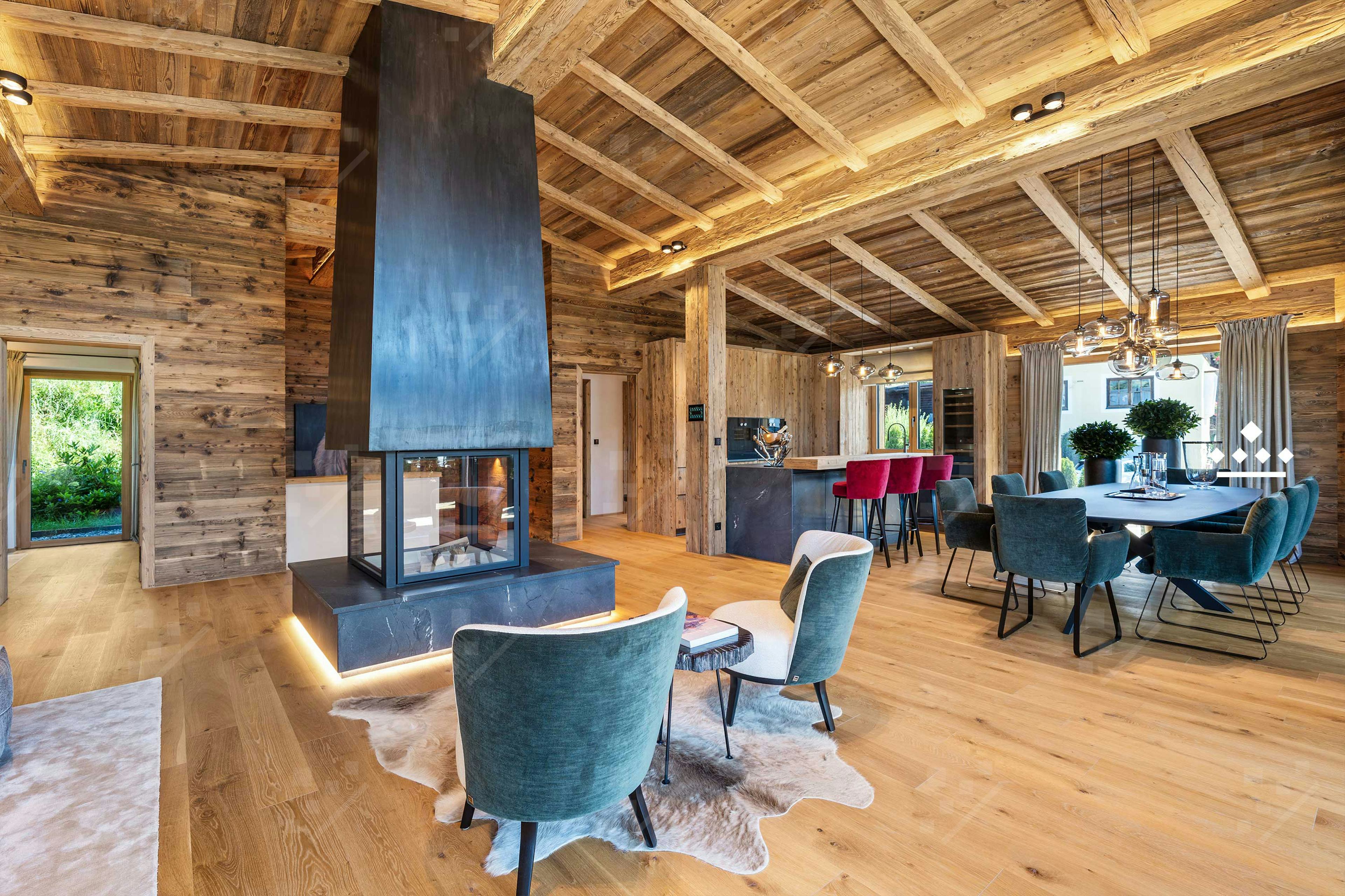 Mit Ausnahme des Multifunktionsraums im Untergeschoss wird das Chalet von einem renommierten Innenarchitekten vollständig eingerichtet. Zum Einsatz kommen hochwertige Materialien wie Altholz, Naturstein, massive Holztüren sowie feinste Armaturen, ergänzt durch elektrische Raffstores und ein modernes BUS-System.