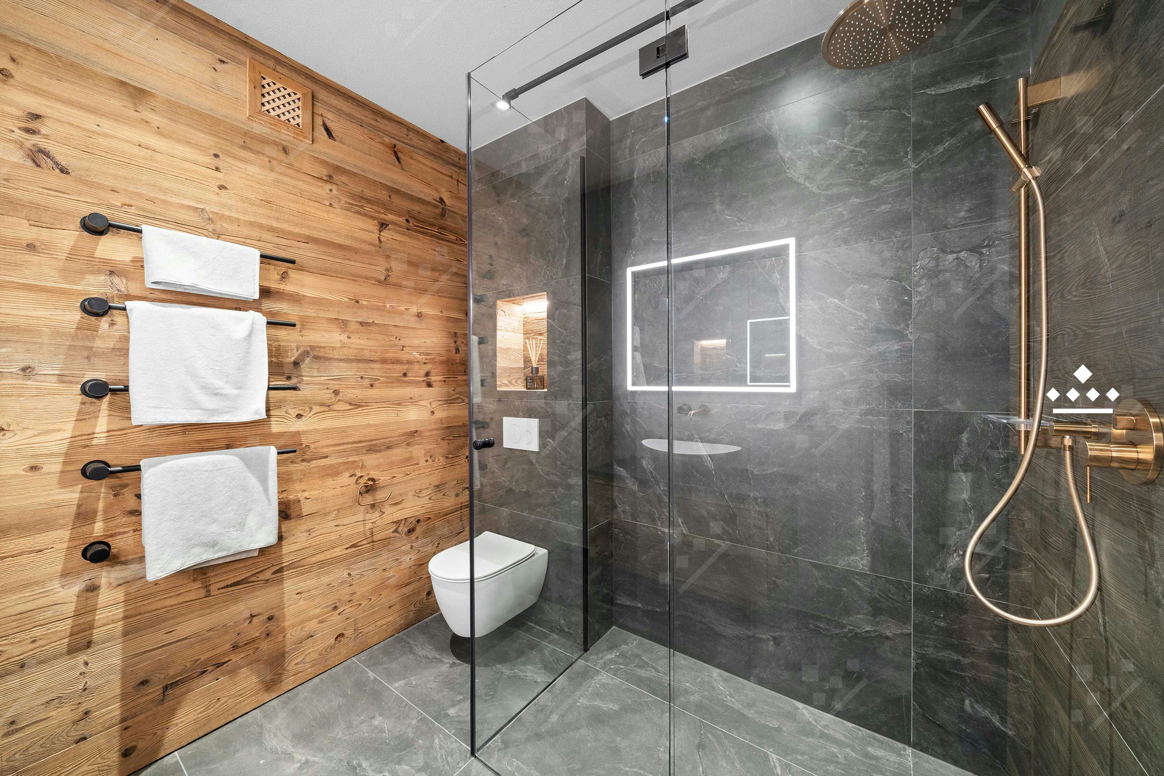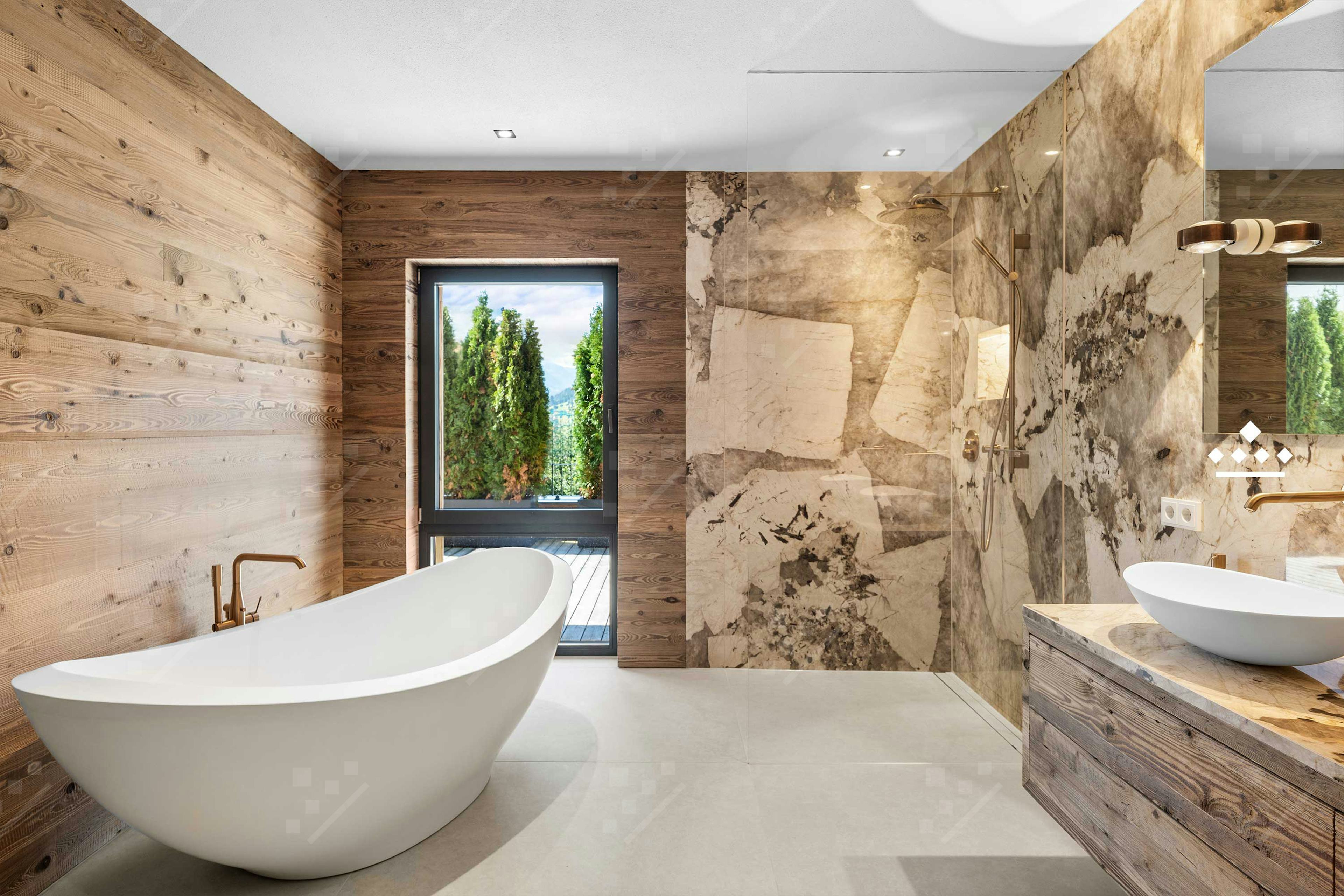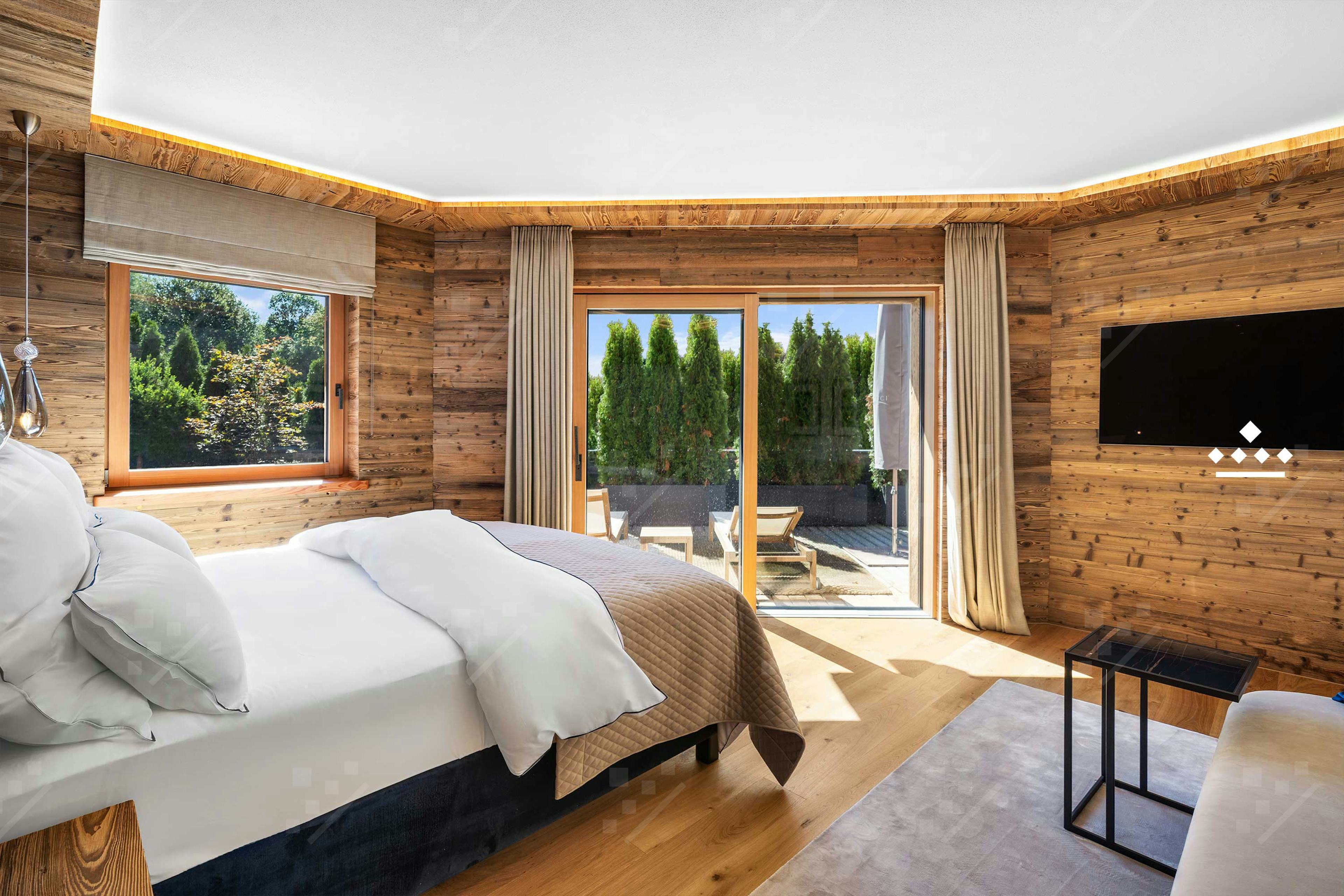 Mit Ausnahme des Multifunktionsraums im Untergeschoss wird das Chalet von einem renommierten Innenarchitekten vollständig eingerichtet. Zum Einsatz kommen hochwertige Materialien wie Altholz, Naturstein, massive Holztüren sowie feinste Armaturen, ergänzt durch elektrische Raffstores und ein modernes BUS-System.