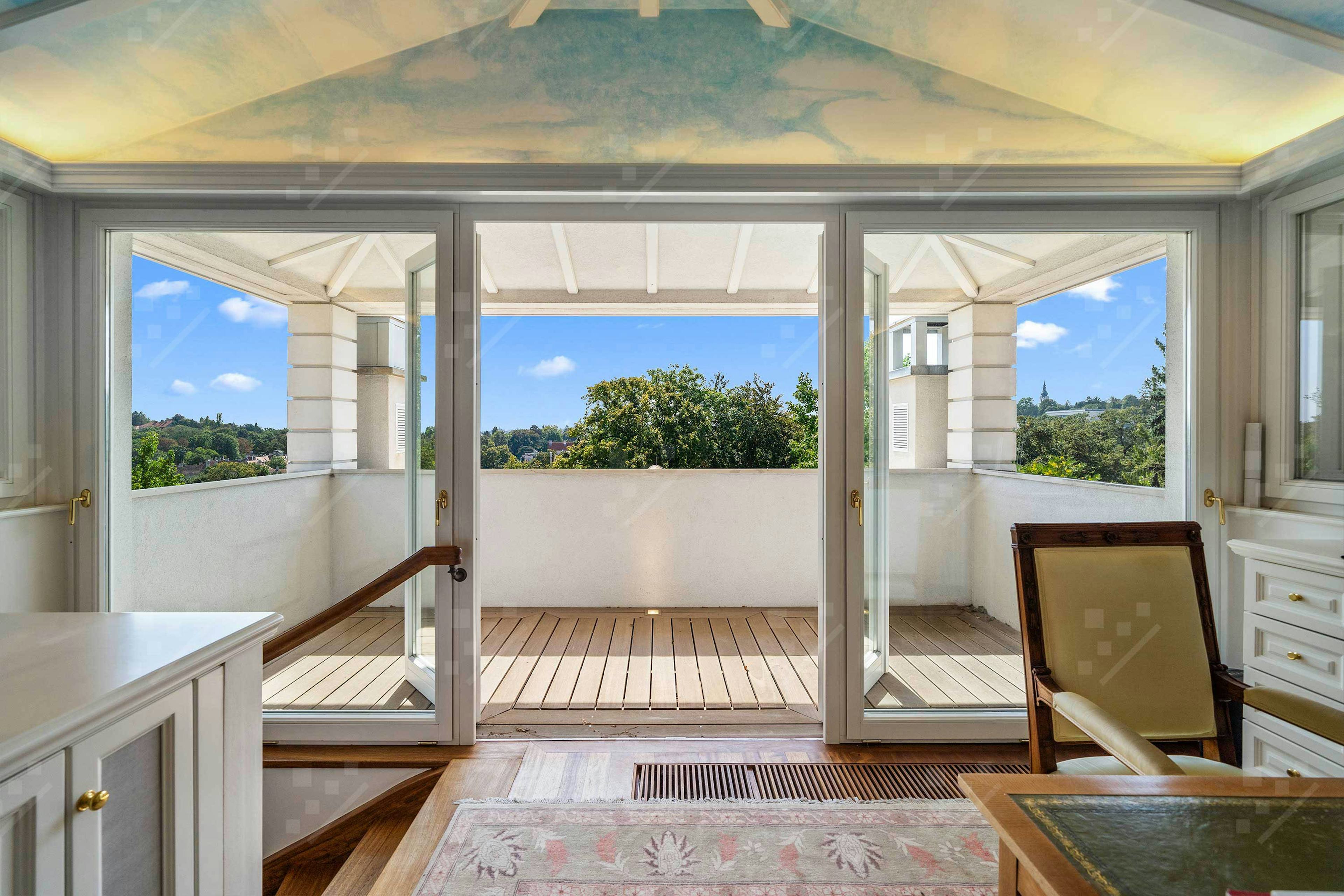 Das Dachgeschoss verfügt über einen Salon bzw. Arbeitszimmer mit Blick auf die umliegende Umgebung, großartigen Lichtverhältnissen und eigener Terrasse mit Blick auf Grinzing. Die vertikale Erschließung der Liegenschaft erfolgt zum einen über einen Personenaufzug, weiters über eine zentrale, elliptisch gewendelte Stiege. Sowohl Ausstattung als auch Außenanlagen sind auf höchstem Niveau ausgeführt und für hochwertigstes Wohnen und Repräsentieren geeignet.
